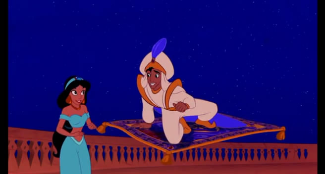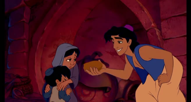 Plot : Aladdin is a street-urchin who lives in a large and busy town long ago with his faithful monkey friend Abu. When Princess Jasmine gets tired of being forced to remain in the palace that overlooks the city, she sneaks out to the marketplace, where she accidentally meets Aladdin. Under the orders of the evil Jafar (the sultan's advisor), Aladdin is thrown in jail and becomes caught up in Jafar's plot to rule the land with the aid of a mysterious lamp. Legend has it that only a person who is a "diamond in the rough" can retrieve the lamp from the Cave of Wonders. Aladdin might fight that description, but that's not enough to marry the princess, who must (by law) marry a prince.