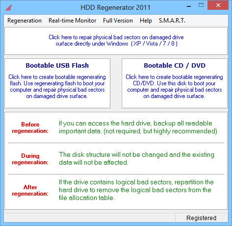 Main benefits Hard disk drive is an integral part of every computer. It stores all your information. One of the most prevalent defects of hard drives is bad sectors on the disk surface. Bad sectors are a part of the disk surface which contains not readable, but frequently necessary information. As a result of bad sectors you may have difficulties to read and copy data from your disk, your operating system becomes unstable and finally your computer may unable to boot altogether. When a hard drive is damaged with bad sectors, the disk not only becomes unfit for use, but also you risk losing information stored on it. The HDD Regenerator can repair damaged hard disks without affecting or changing existing data. As a result, previously unreadable and inaccessible information is restored.